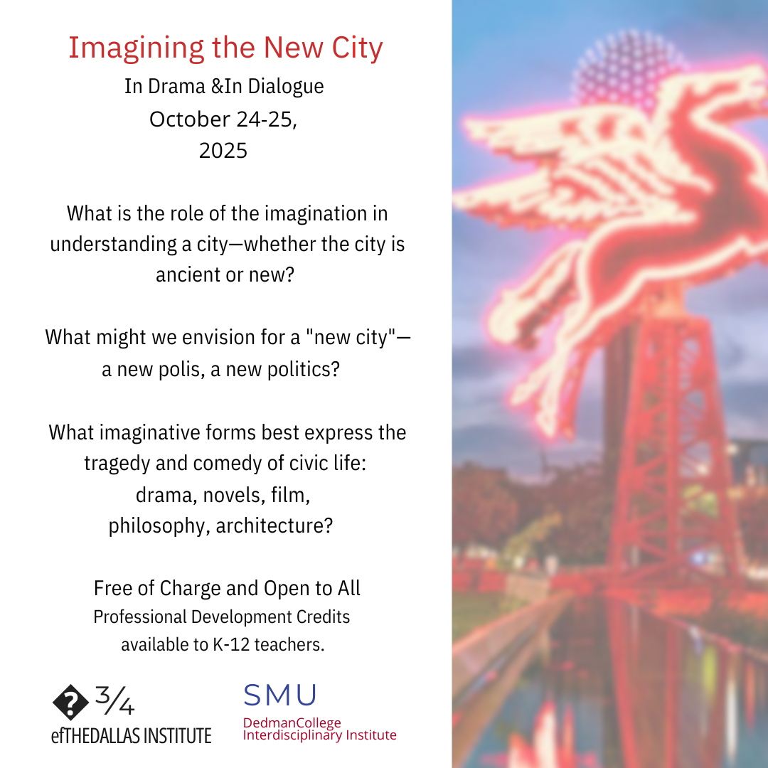 What Makes a City? The Dallas Institute has been asking this question for decades... and now that we're at SMU, we have invited colleagues from campus and beyond to consider anew how we imagine civic life. This symposium focuses on the dramatic forms of tragedy and comedy and how they might RENEW a city and its citizenry. Conceived in ancient Athens, these dramatic forms continue to provide a lens for us to understand our own contemporary imaginings of the city: the city we want, the city we lament, and the city we actually have.