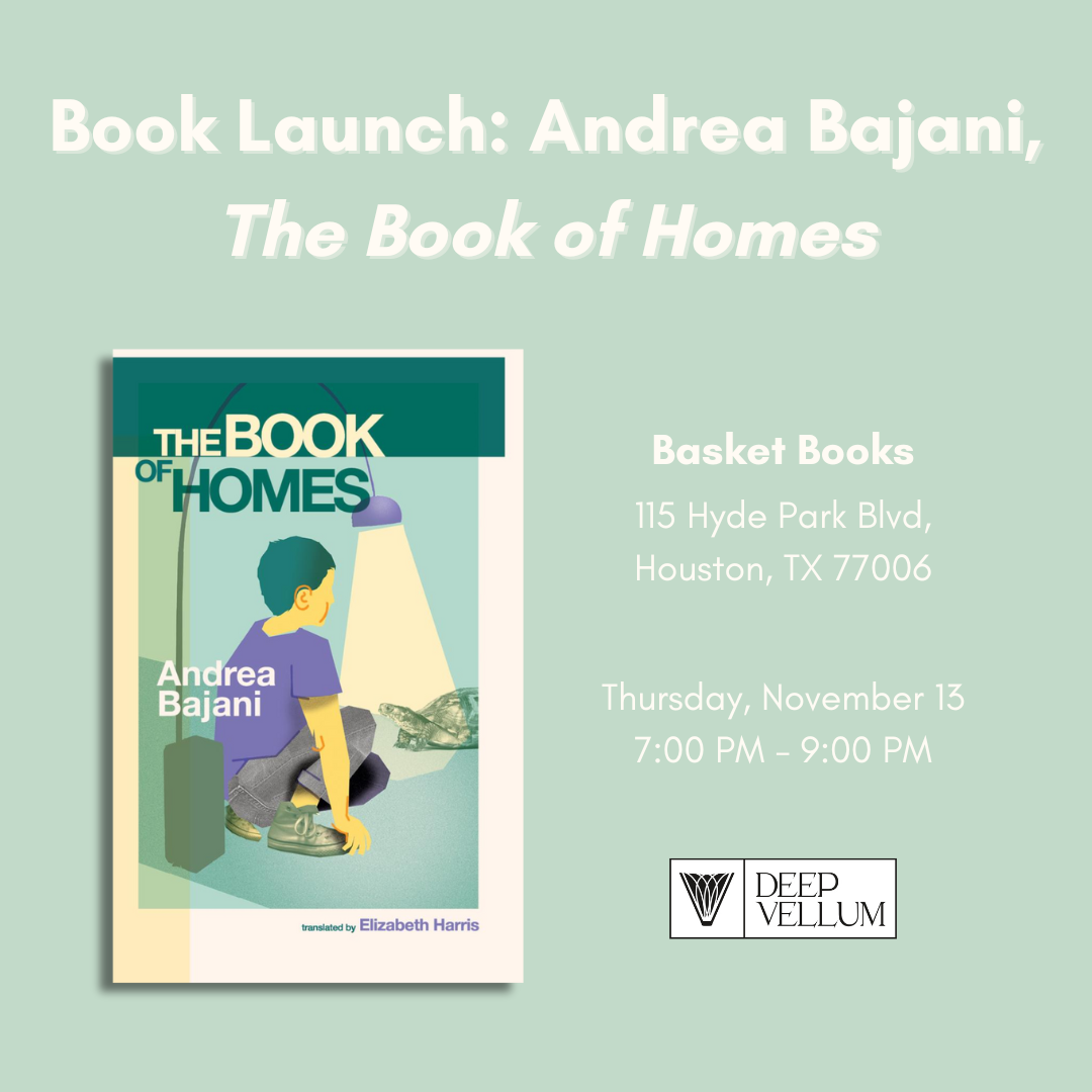 Join us in Houston for the launch of Andrea Bajani’s The Book of Homes at Basket Books. Andrea will be join by Roberto Tejada.