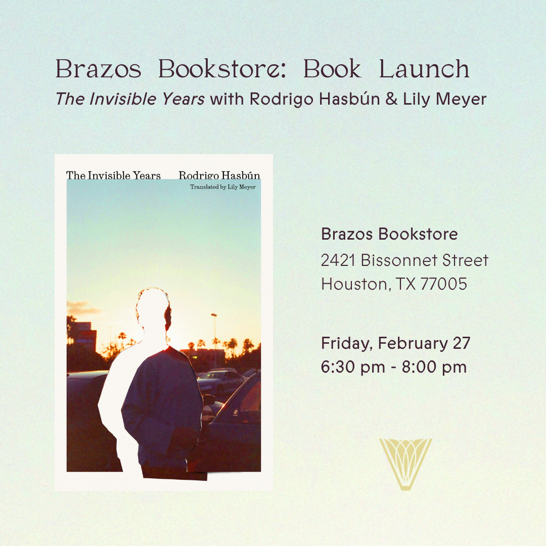 Join us in Houston at Brazos Bookstore for a discussion with Rodrigo Hasbún and Lily Meyer in celebration of the release of The Invisible Years. This event is in-person on Friday, February 27 at 6:30 p.m.