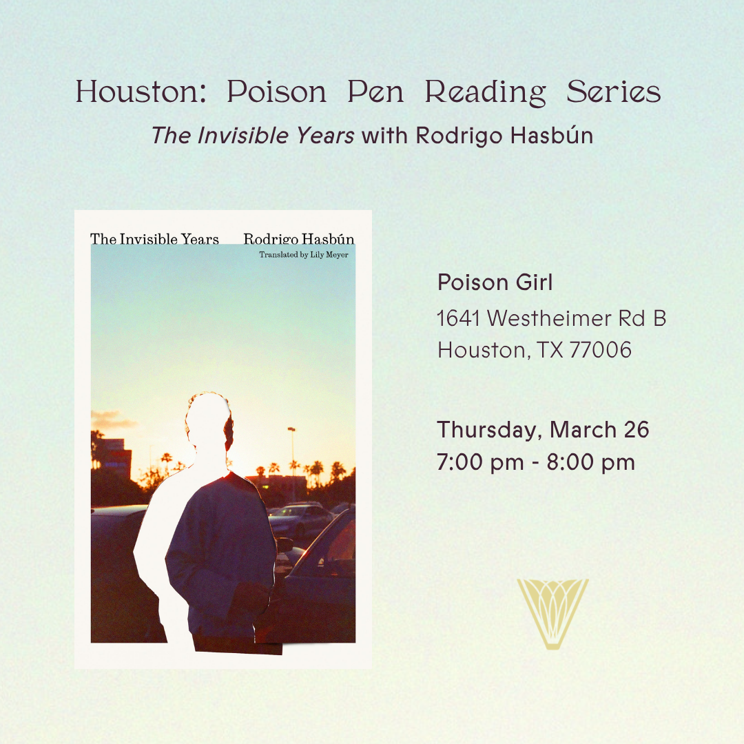 Join us in Houston at Poison Girl Bar for reading from The Invisible Years with Rodrigo Hasbún.