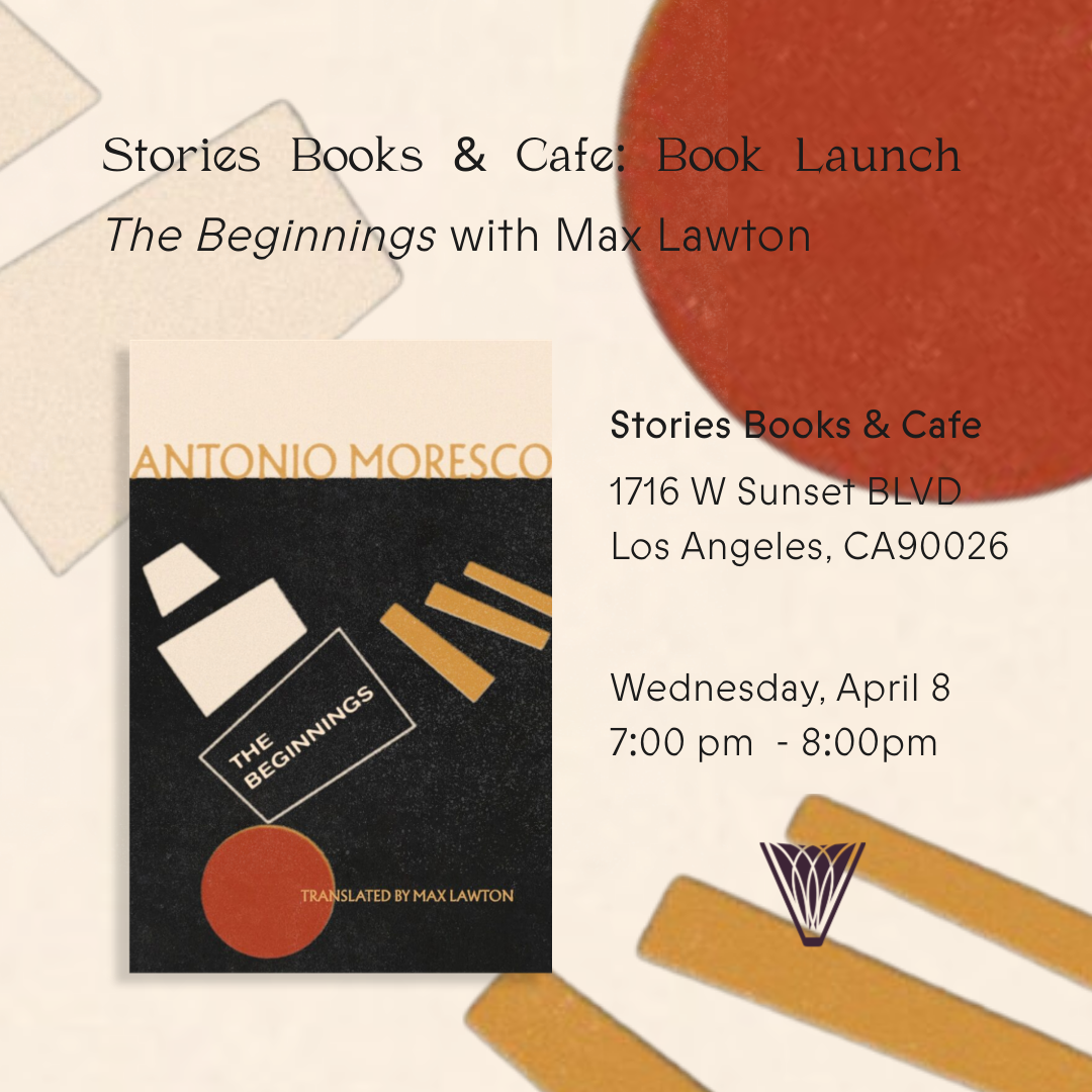 Join Max Lawton in celebrating the publication of Antonio Moresco's The Beginnings. This is an in-person event which will be held at Stories Books & Cafe.