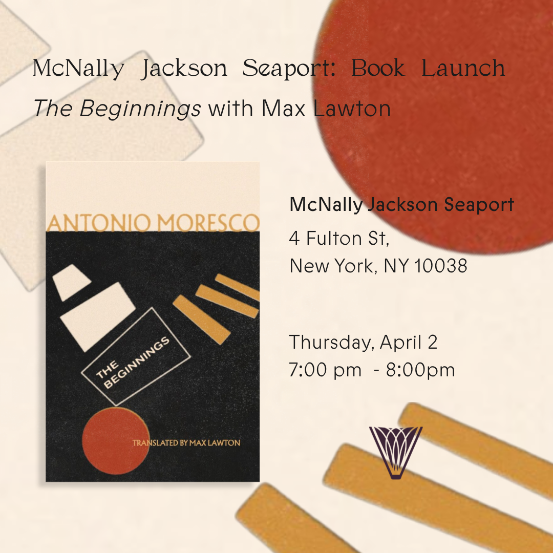 Join Max Lawton, Grace Byron, and Francesco Pacifico in celebrating the publication of Antonio Moresco's The Beginnings. This is a ticketed event which will be held in person at McNally Jackson Seaport.