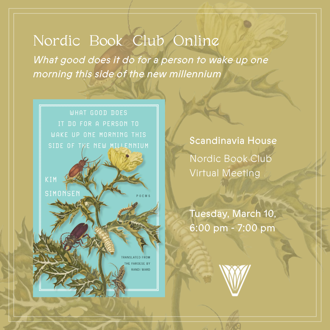 Read and discuss literature with Scandinavia House’s Nordic Book Club Online! Nordic Book Club meets monthly via Zoom to discuss contemporary literature in translation. On March 10, 2026, in coordination with our film festival West Nordic Film Days, they will be discussing Faroese author and Nordic Council Literature Prize nominee Kim Simonsen’s poetry collection What good does it do for a person to wake up one morning this side of the new millennium, in translation by Randi Ward.