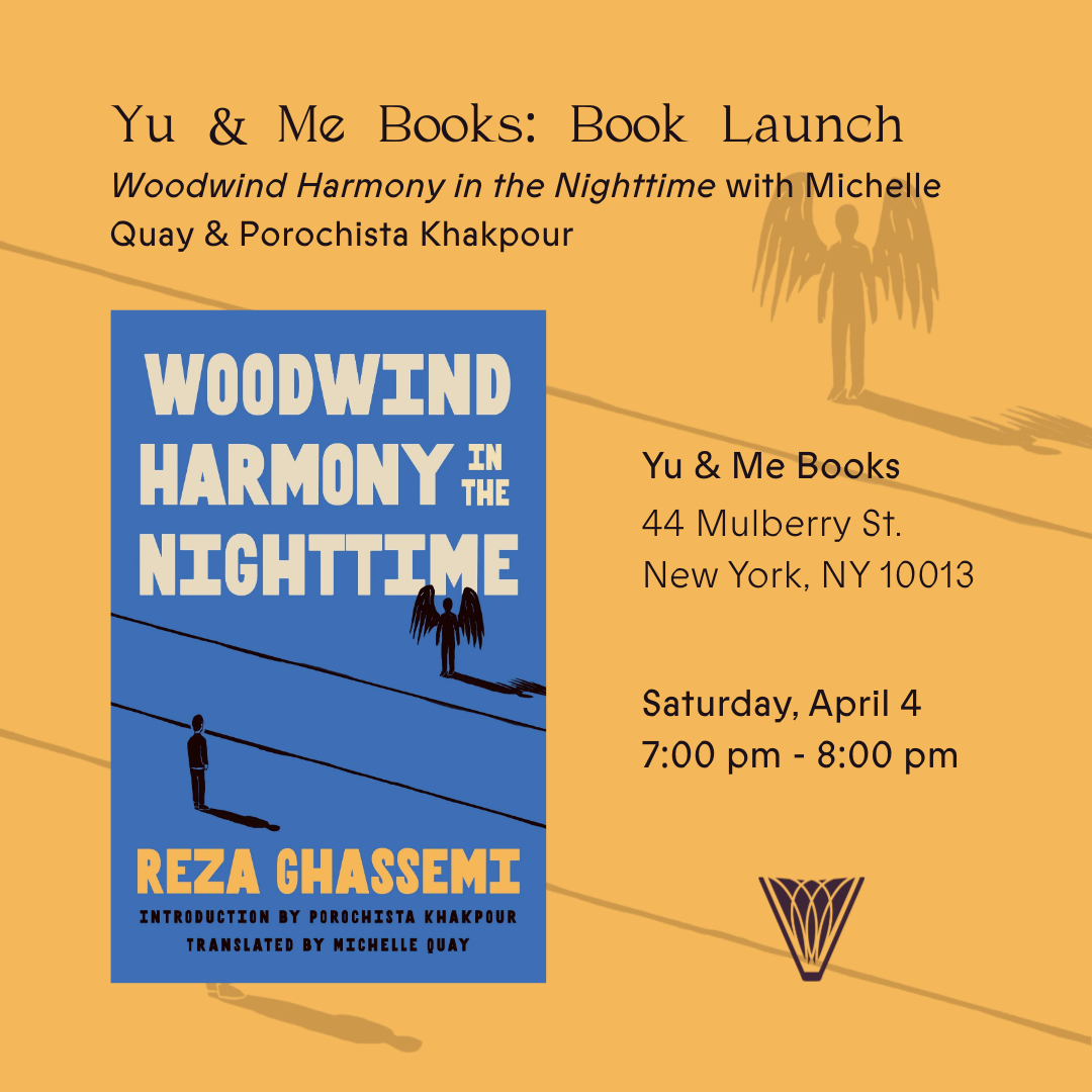 Join Michelle Quay and Porochista Khakpour at Yu & Me Books for the launch of Reza Ghassemi’s Woodwind Harmony in the Nighttime! This event will be held in person, Saturday, April 4th at 7:00 pm.